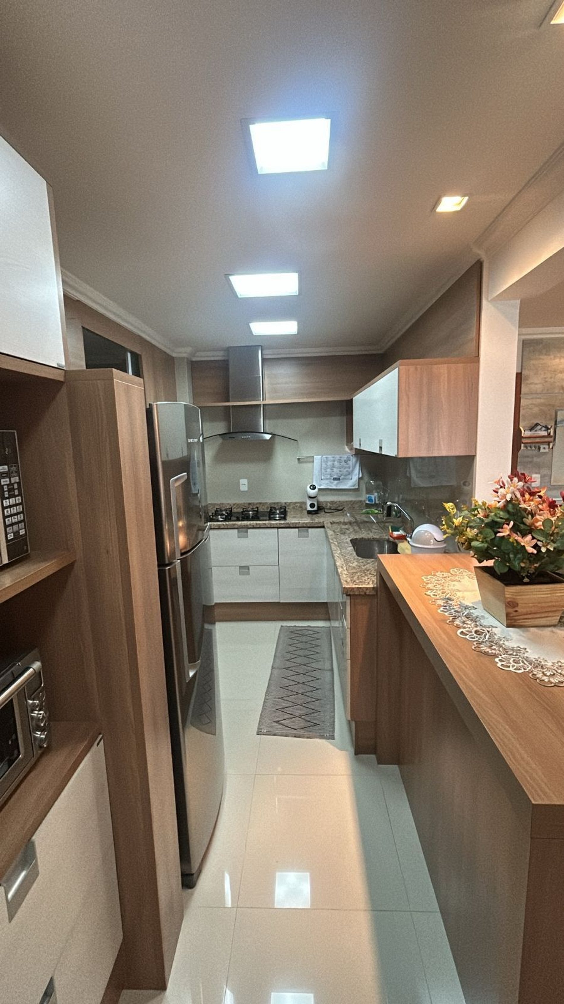 Sala de estar com dois sofás-camas, Cozinha e sala de jantar, uma suíte e um quarto casal mais solteiro, sacada com churrasqueira e garagem para dois carros.
