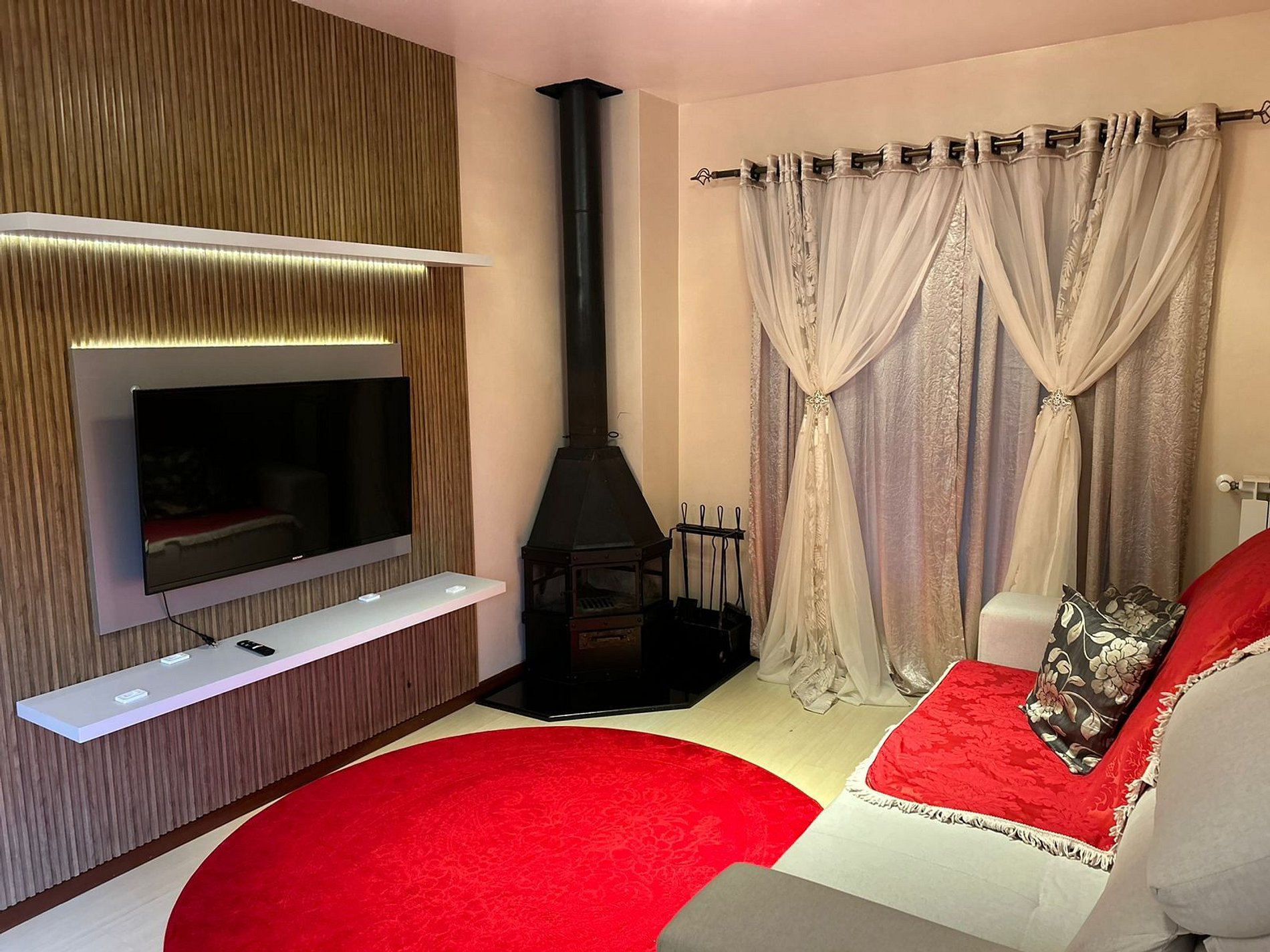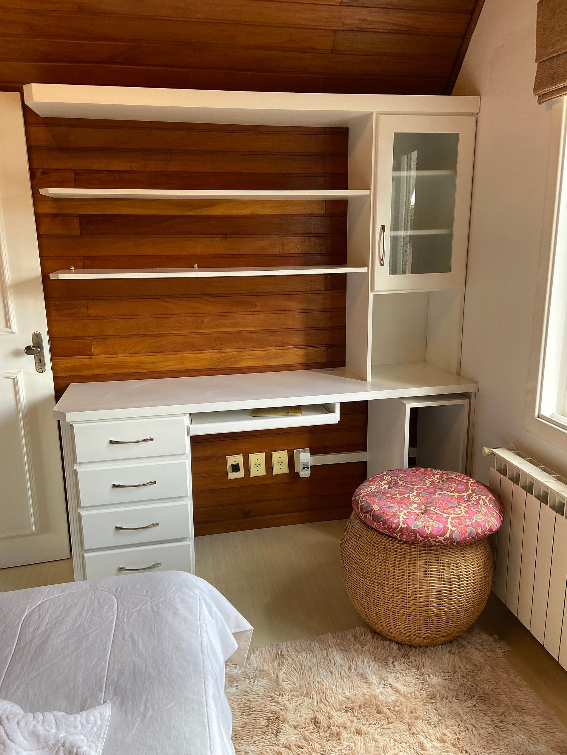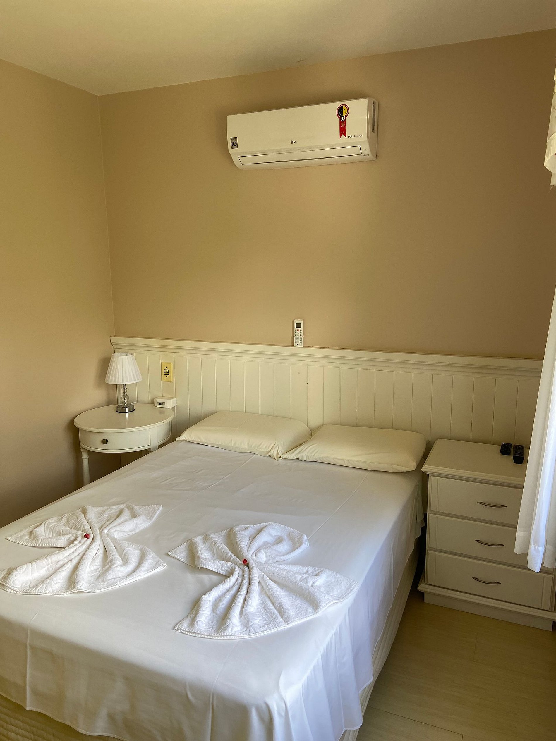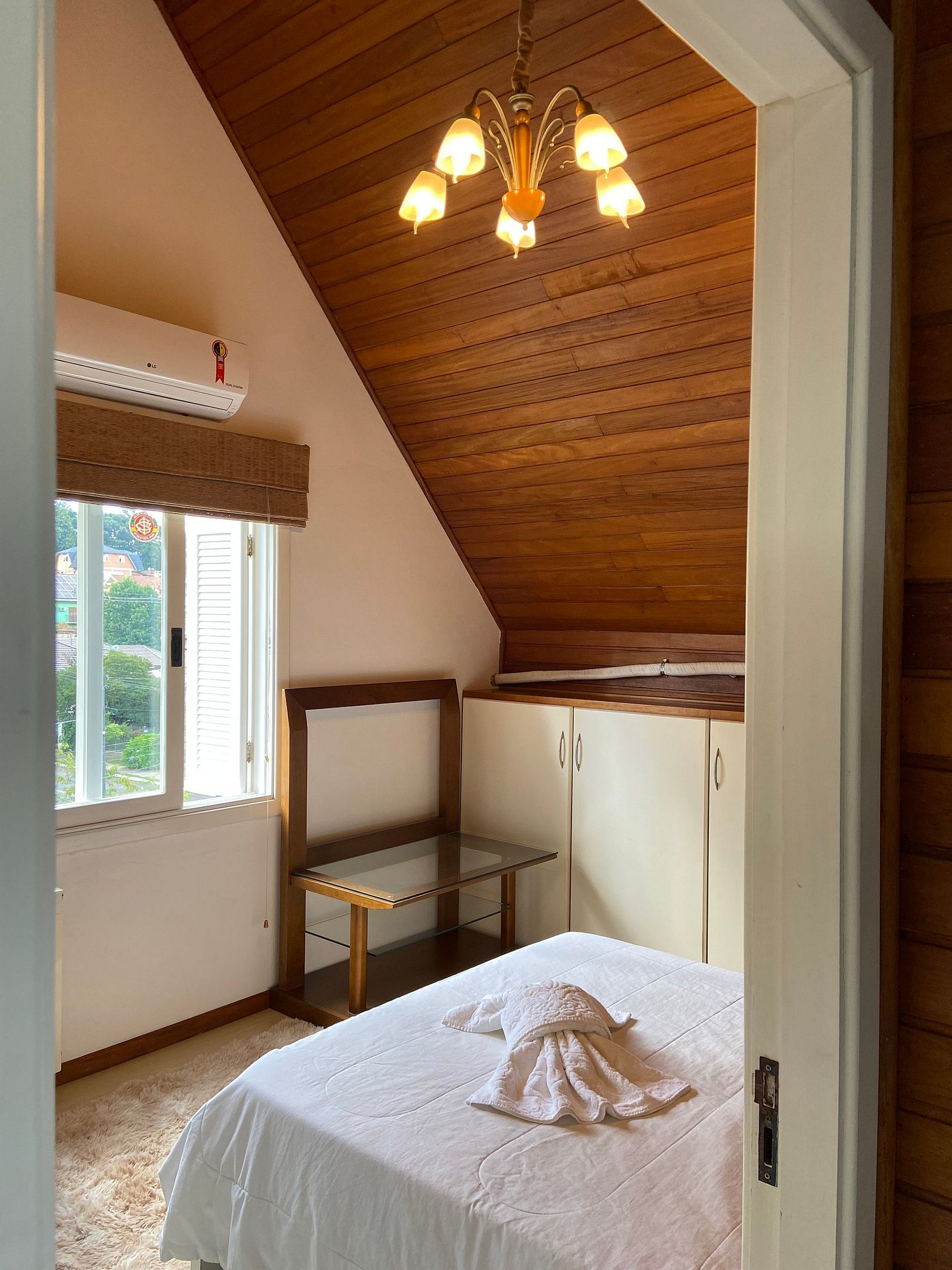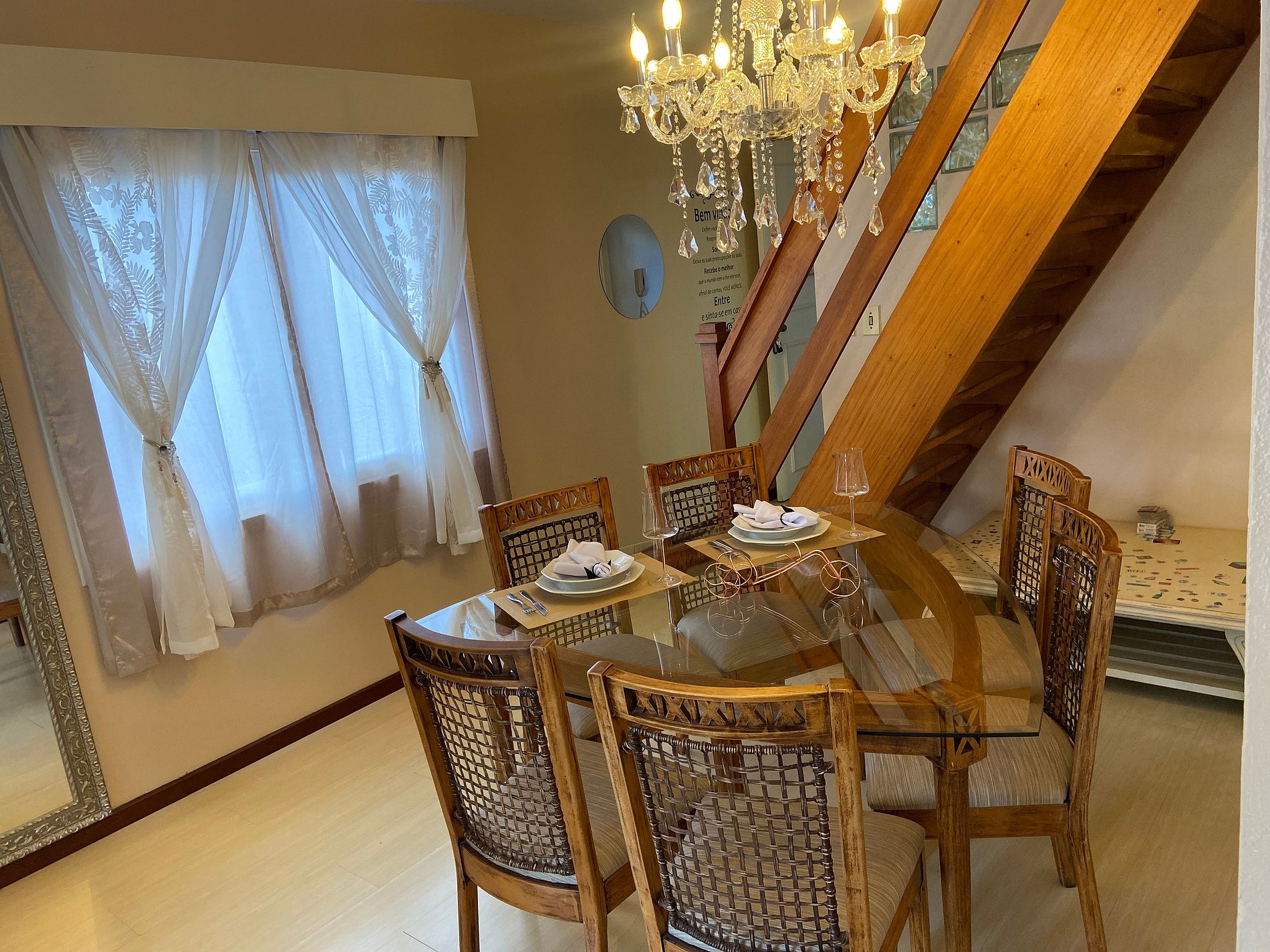 El apartamento dispone de: Dispone de 4 dormitorios, 1 de los cuales es suite. Abajo: 1 suite con cama de matrimonio y otro dormitorio con 2 camas individuales. Planta alta: 1 dormitorio doble y 1 dormitorio con 2 palcos individuales + auxiliar, este con posibilidad de juntarse y formar una cama doble queen. También ponemos a su disposición una cuna, solicítela en el momento de la reserva. Tiene 3 baños, dos de los cuales están en la planta baja. Sala de estar con TV... TV con comando de voz y netflix, chimenea, sofá, cocina completa con utensilios como “platos, vasos, tazones, cubiertos, sartenes, heladera, estufa, microondas. Aire acondicionado en los dormitorios y salón y también tiene chimenea en el salón, además de calefacción, dando ese encanto en las noches frías de Gramado. Dispone de wi-fi, aire acondicionado frio-calor. Caja en el garaje para 1 coche. Toallas y ropa de cama. Ponemos a disposición de los huéspedes toallas de baño y toallas de cara, así como sábanas y edredones. Artículos de higiene. Proporcionamos jabón en barra, jabón líquido y papel higiénico.