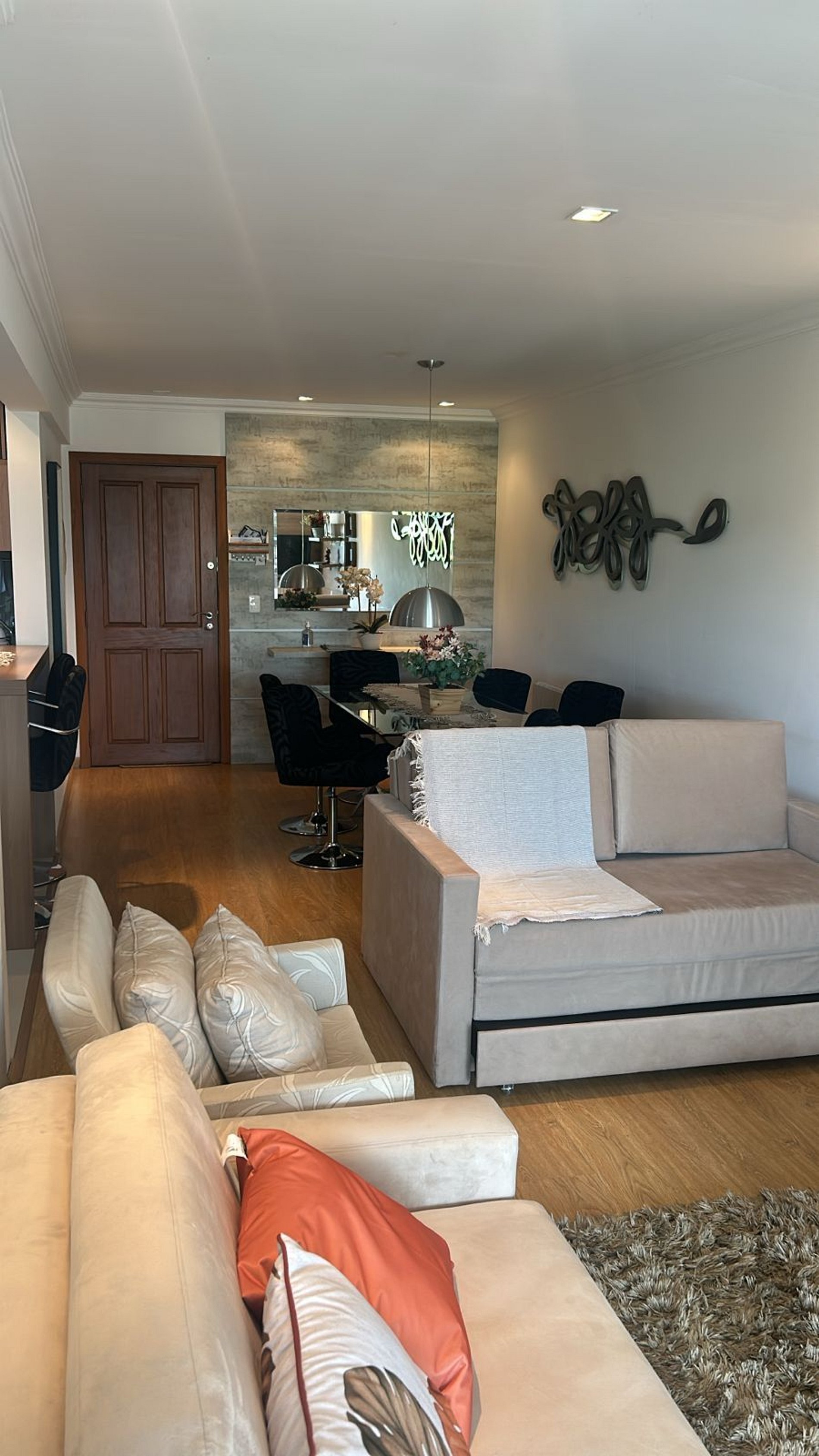 Sala de estar com dois sofás-camas, Cozinha e sala de jantar, uma suíte e um quarto casal mais solteiro, sacada com churrasqueira e garagem para dois carros.