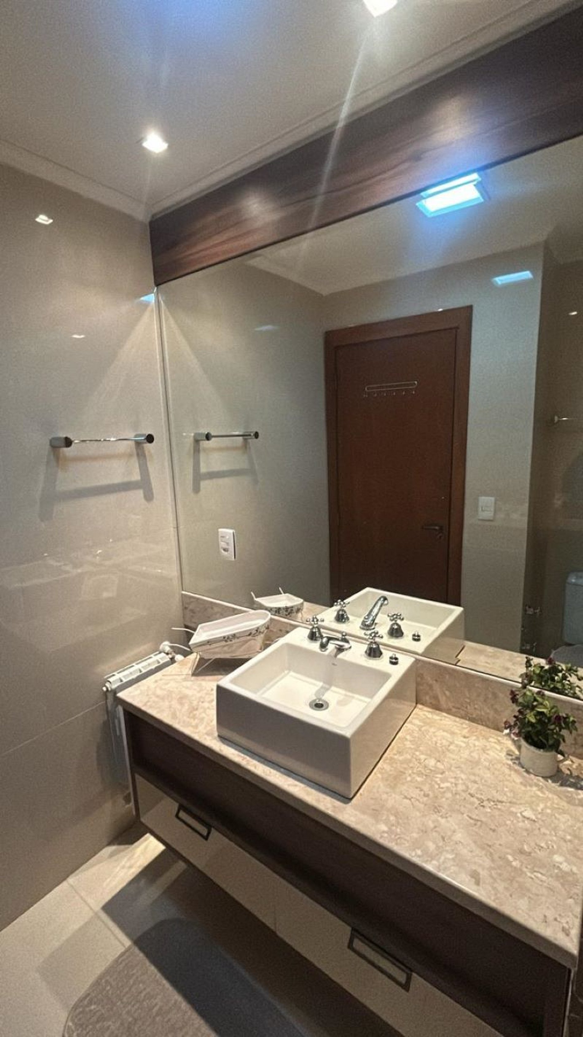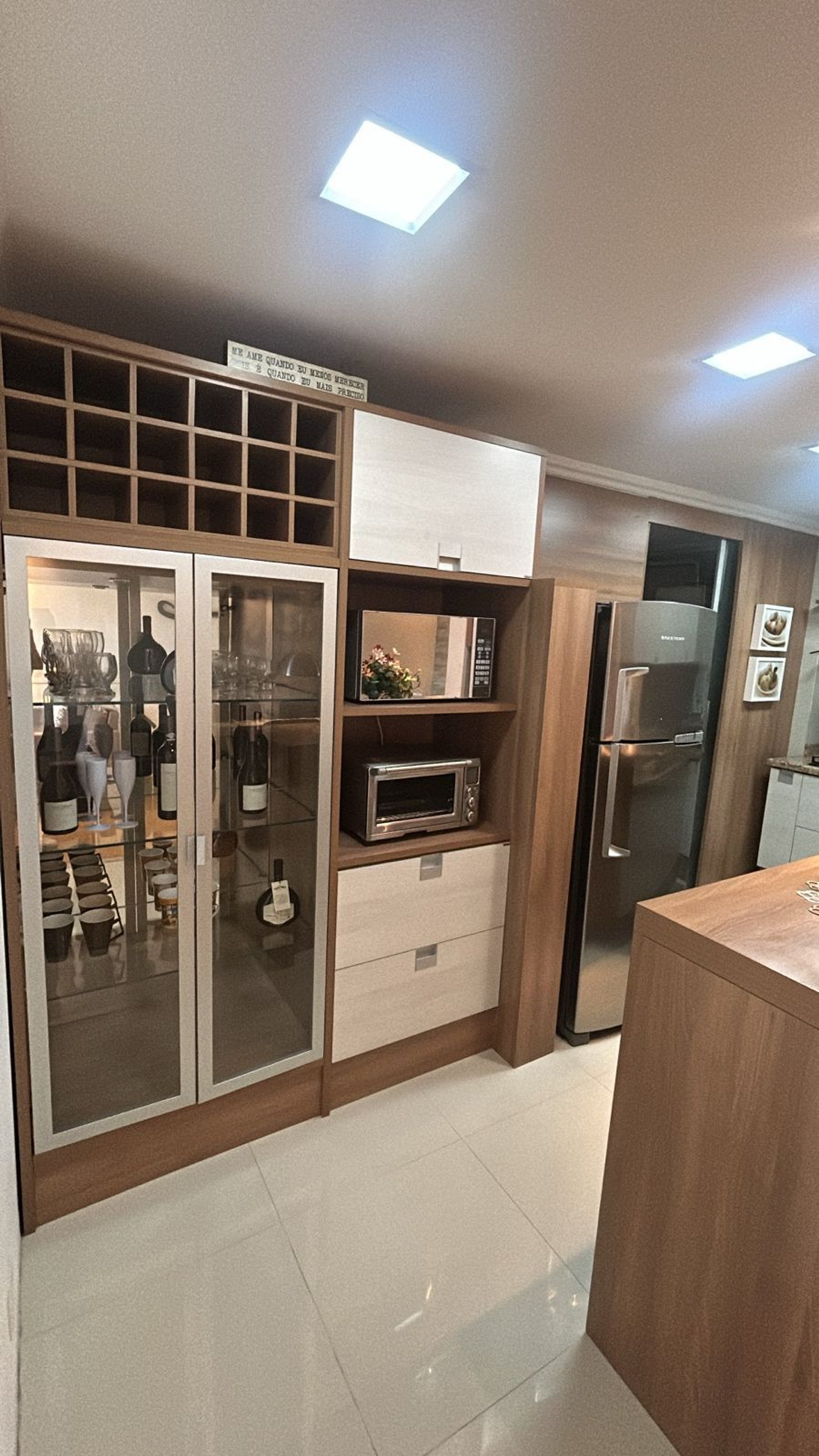 Sala de estar com dois sofás-camas, Cozinha e sala de jantar, uma suíte e um quarto casal mais solteiro, sacada com churrasqueira e garagem para dois carros.